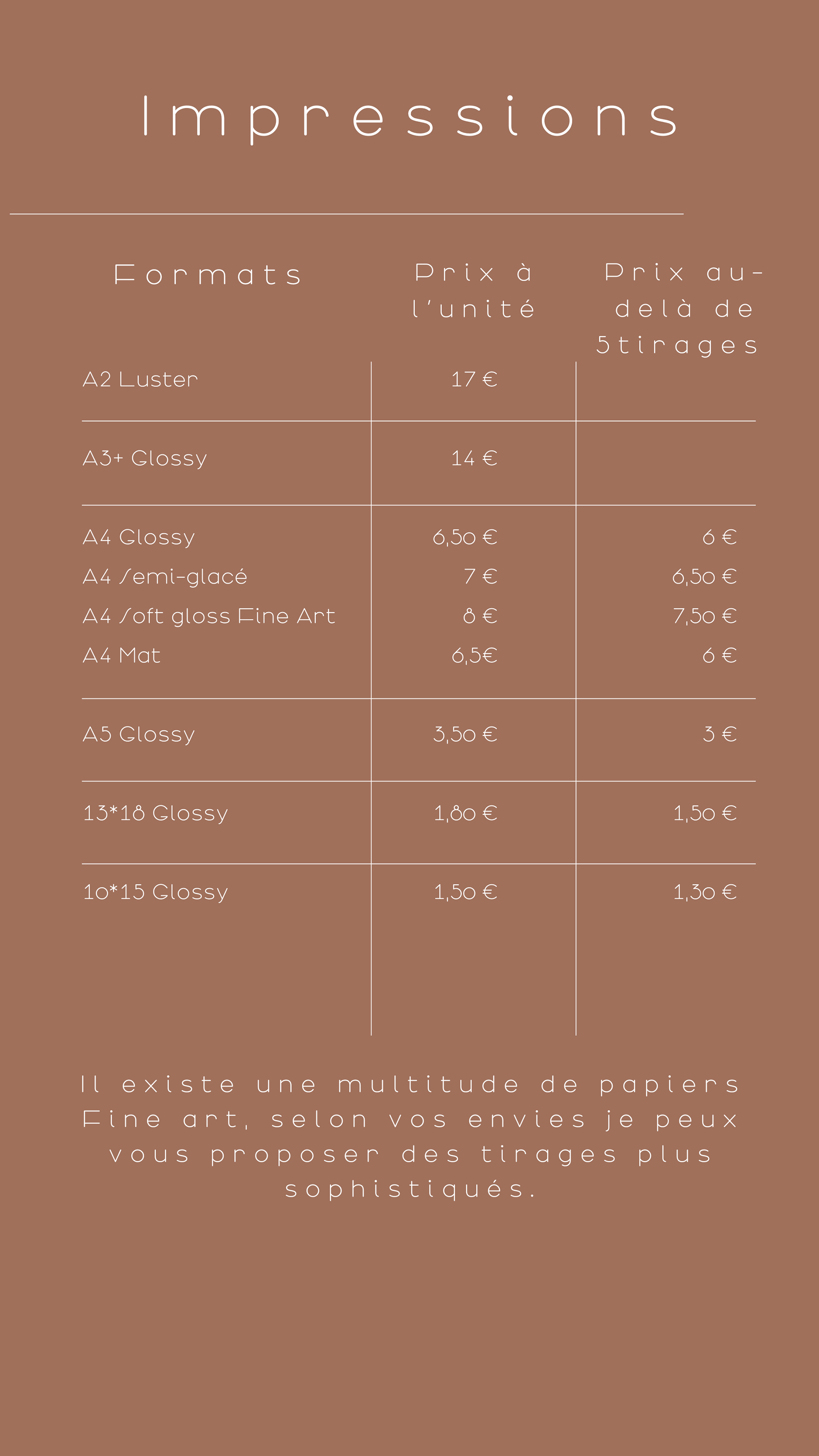 Je produits moi-même mes tirages, vous assurant ainsi la meilleure qualité et une colorimétrie parfaite. Je propose des tirages du A2+ au au 10x15 cm.